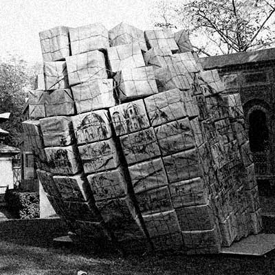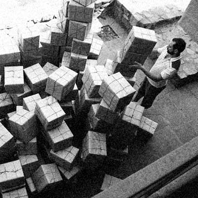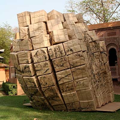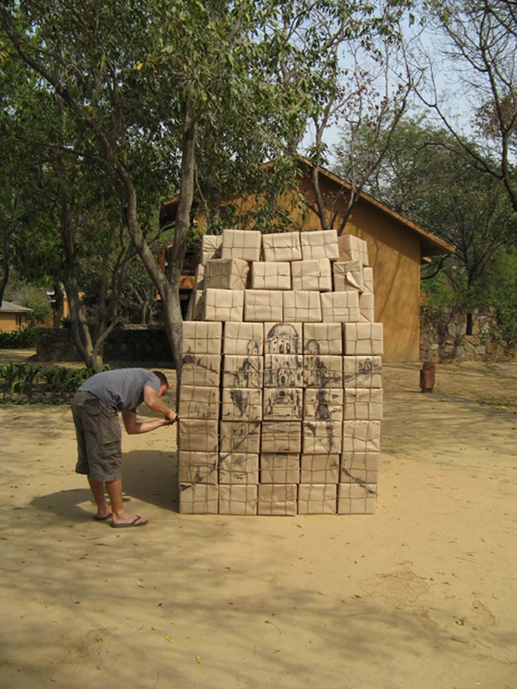 What We Carry With Us Cardboard boxes, brown paper, twine, cart